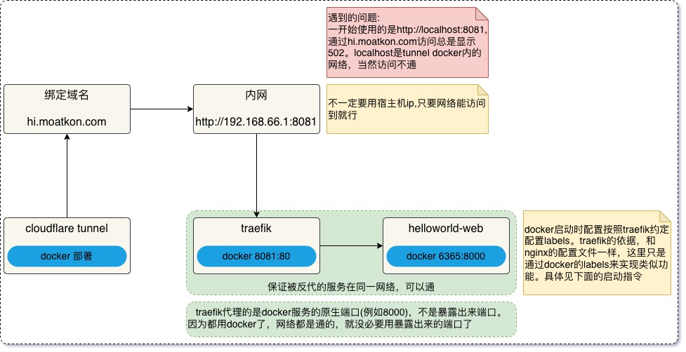 docker run -d --name web-test --network traefik_network -p 6365:8000 --label "traefik.enable=true" --label "traefik.http.routers.web-test-router.rule=Host(\"hi.moatkon.com\")" --label "traefik.http.services.web-test-service.loadbalancer.server.port=8000" crccheck/hello-world- 测试 HelloWorld 是否正常: